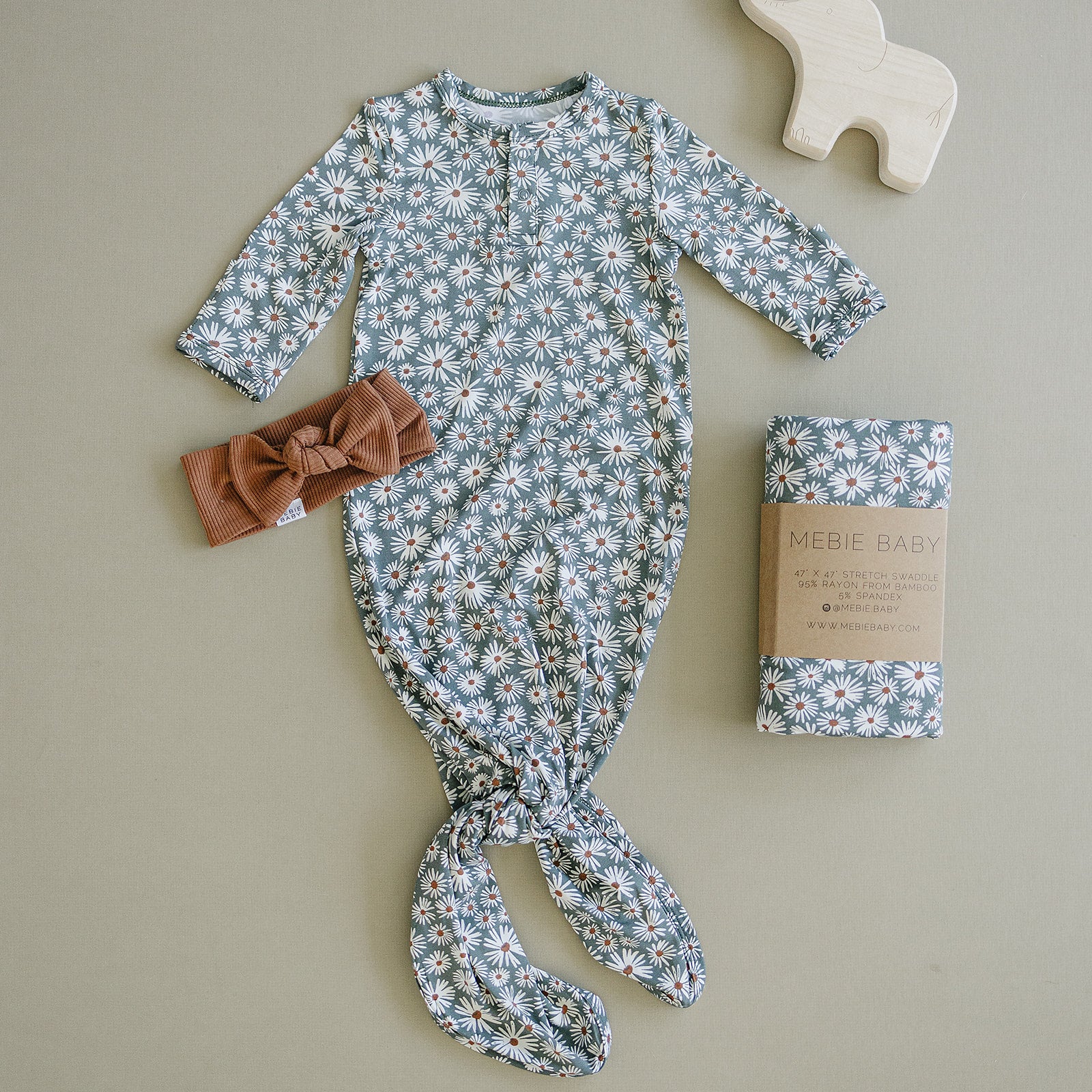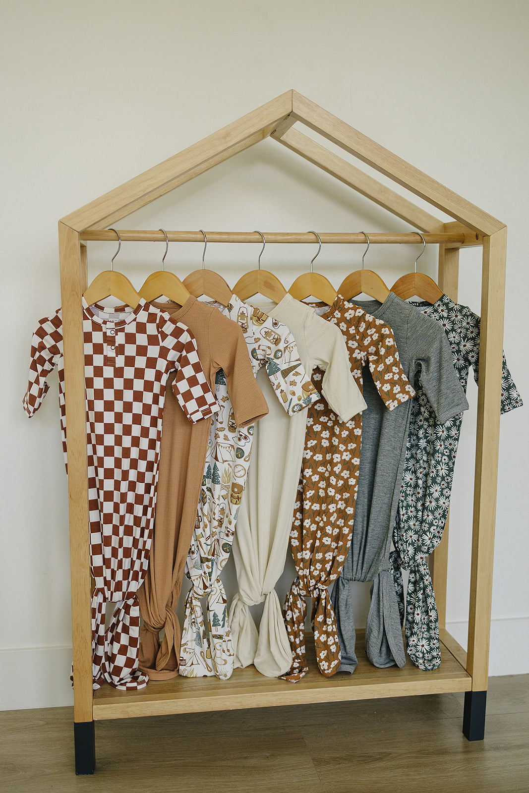 These gowns are size 0-3. They are made out of supremely soft Bamboo Rayon to keep your little one comfortable. We have a variety of gender neutral designs and colors making them perfect for any baby. They have fold over hands and two snaps for easy on and off. We also have shoulder flaps to make it easily pull over your little ones head, we want to make dressing your baby as easy as possible. The bottom is easily tied and untied in a knot for no-fuss diaper changes which makes it a newborn baby essential! These are made out of the same fabric as our stretch swaddles and match the colors of the stretch swaddles, head wraps, and hats.