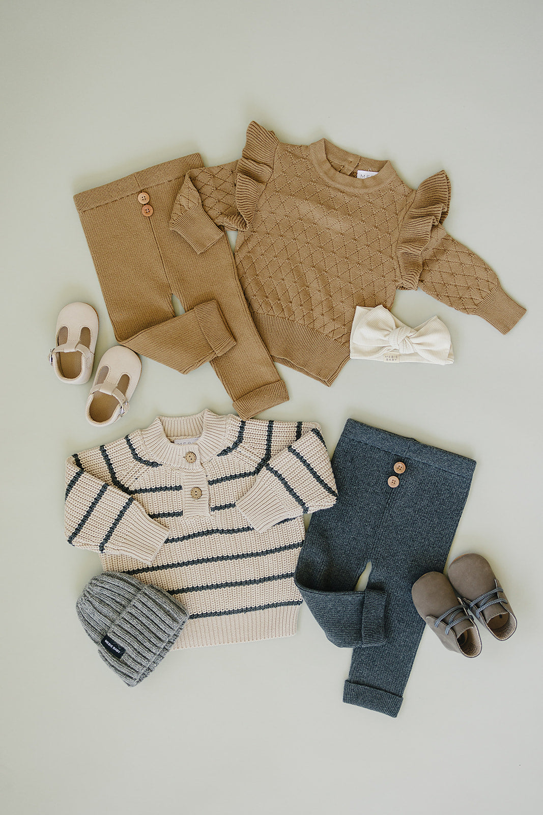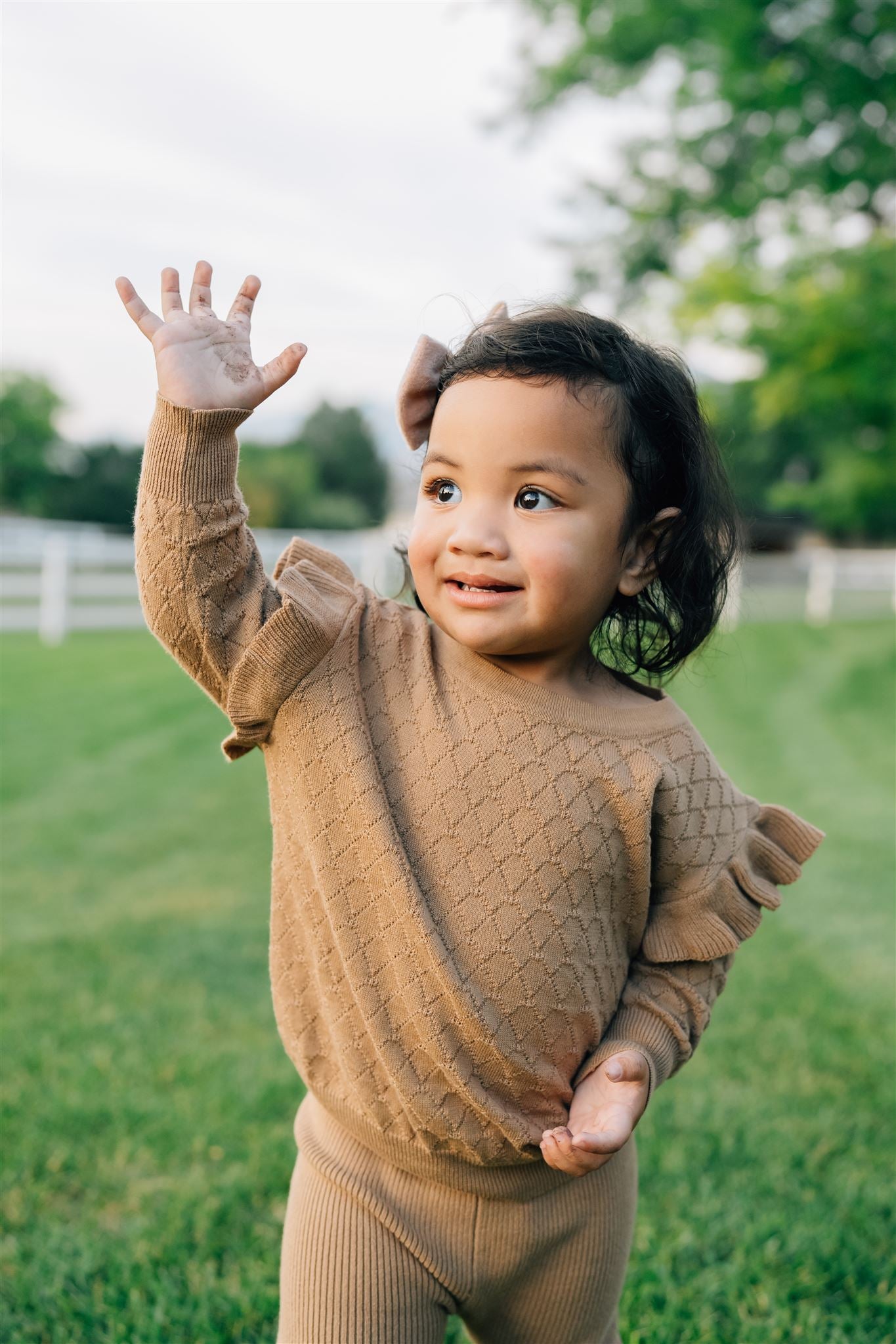 Elevate your child's style with our Toffee Knit Ruffle Sweater. Shop now for a blend of comfort, elegance, and timeless charm!